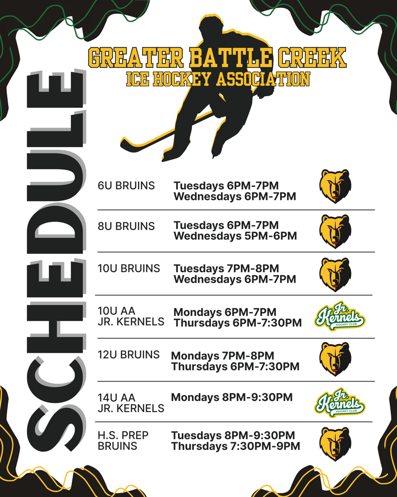 Ready to hit the ice this fall? Join the Battle Creek Bruins for an exciting season of skill-building, teamwork, and competitive hockey! Whether you're returning to the team or lacing up your skates for the first time, we can't wait to welcome you to the Bruins family.